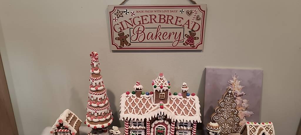 12” Wooden Gingerbread Bakery Wreath Sign: Brown, Cream, Red, Green, & Burgundy